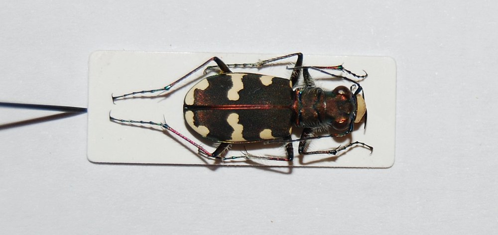 questa bella cicindela, presente sul nostro appennino abbondante ma a tratti localizzata, si rinviene, come tutte le rappresentanti della sua sottofamiglia, nelle ore più calde del giorno, da quando colpisce la sabbia fino a quando resta in ombra più o meno, nelle strisce sabbiose dei fiumi e dei torrentelli, questa l'ho raccolta il 17 maggio di quest'anno (sempre quella volta  ) su un cordone sabbioso appunto del fiume secchia ai gessi reggiani (RE), la foto non è un granchè come sempre ma si riescono ad apprezzare i colori e i caratteri  :