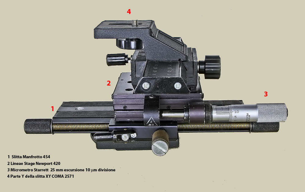 Della slitta COMA 2571 che in versione integrale potete trovarla quì ho utilizzsato solamente la parte Y in quanto la Manfrotto 454 per le macro-traslazioni X mi dava più affidamento di rigidità e robustezza.