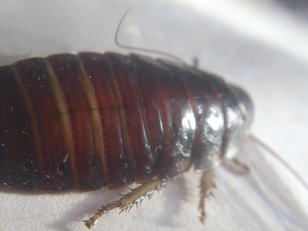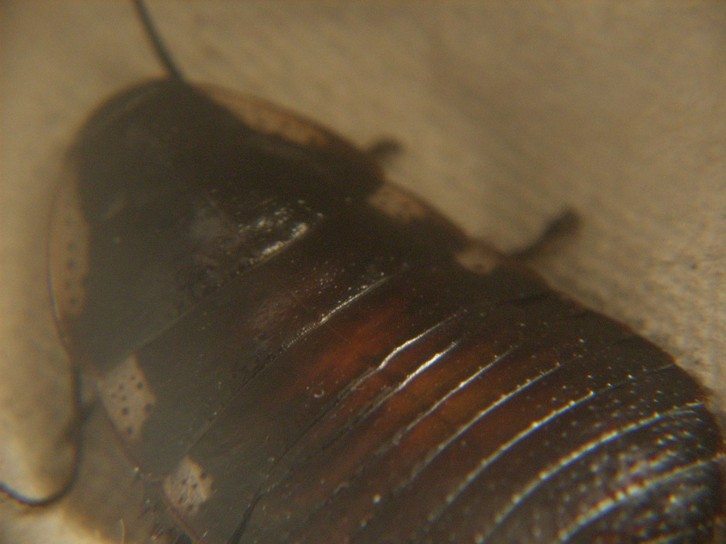 Grossa blatta del Madagascar che mi sono fatto regalare per natale 2009. Avevo iniziato con 10 adulti e ora mi ritrovo con 8 adulti e circa 20 neanidi. Come mezzo di difesa utilizzano...il soffio! Infatti queste blatte se disturbate emettono aria dagli spiracoli dando luogo a dei soffi. è una blatta molto interessante da allevare in quanto i maschi combattono usando le escrescenze a forma di corna presenti sul pronoto. I combattimenti iniziano con un maschio che "minaccia" soffiando, mettendosi ritto sulle zampe e alzando l'addome verso l'alto; continuano poi prendendosi a cornate per tutta la notte(le prime notti non sono riuscito a dormire :lol: ). Il maschio più forte poi ha diritto a un suo territorio e a un harem di femmine, gli altri maschi possono mettersi fuori dal territorio o stare all'interno di quello del maschio dominante comportandosi in modo sottomesso.
