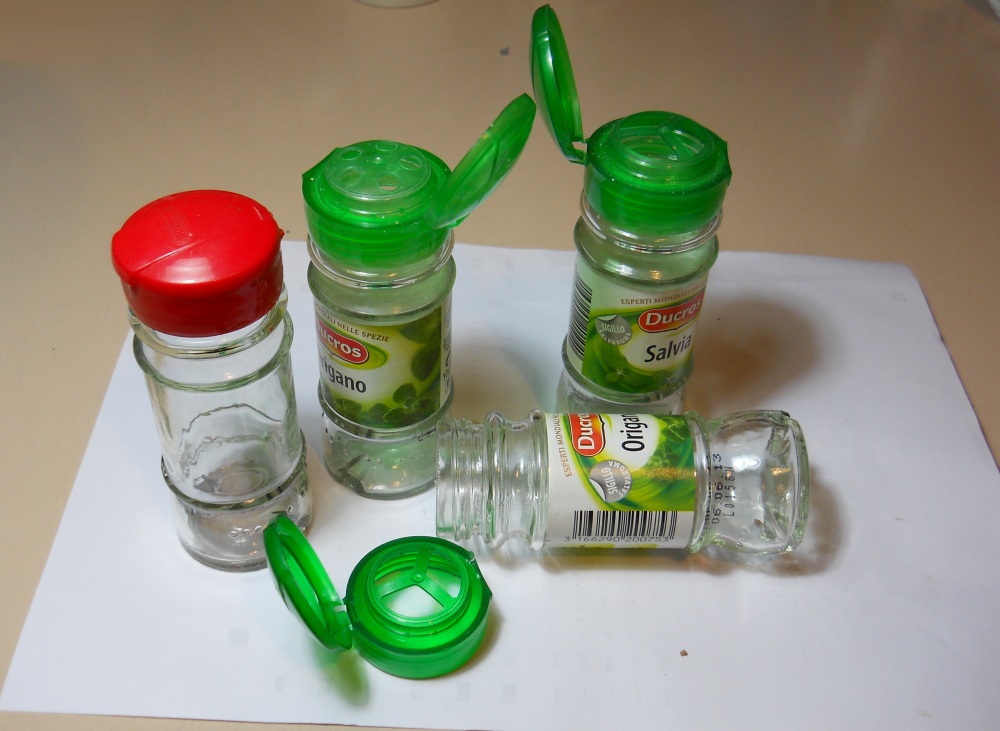 I flaconcini dei medicinali sono ottimi come contenitori dei vari liquidi che usiamo in entomologia, i barattoli di vetro delle conserve possono essere usati in molti modi, tra cui, come trappole a caduta o come contenitori per insetti vivi (vanno benissimo per le larve dei formicaleoni o simili, riempiti per qualche cm del loro substrato) da allevare, dopo aver fatto qualche foro nel tappo.