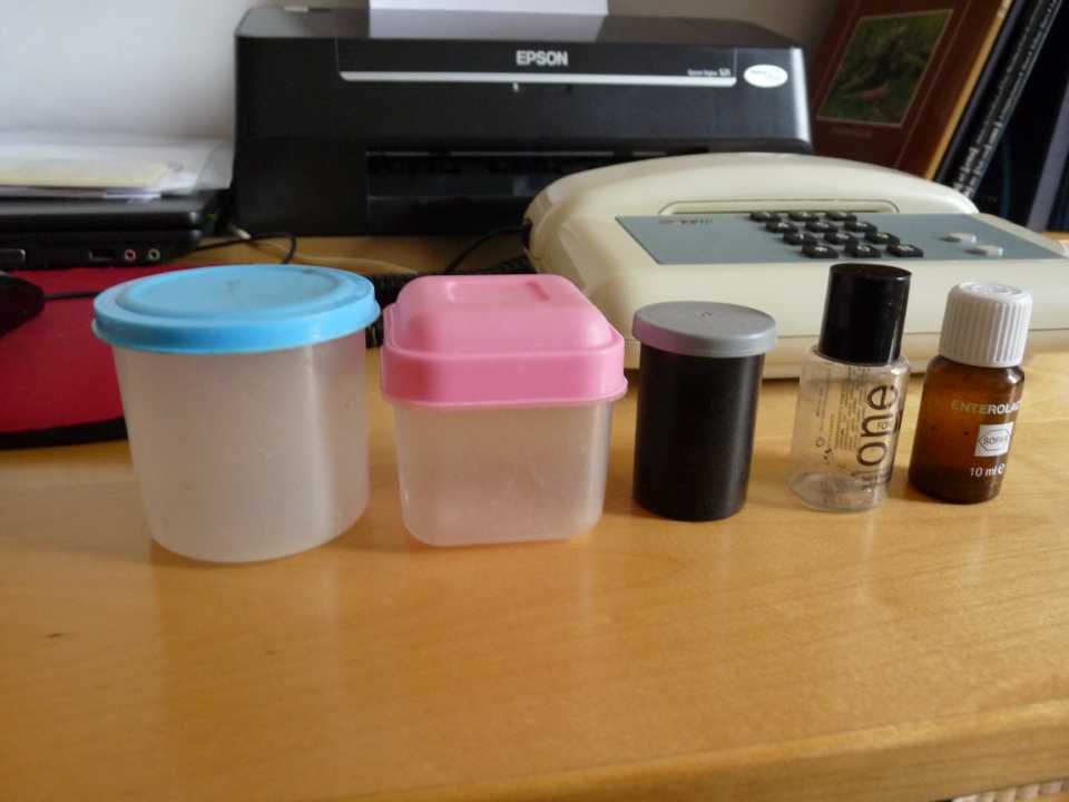 I contenitori delle pellicole sono i più utili, poichè si possono usare sia come piccolo barattolo per la raccolta, sia come contenitori per il materiale da preparare, sia per il trasporto di uno o due insetti preparati e su cartellino, spillati su fondo di plastozote, sia, quelli bianchi e semitrasparenti, come cilindretti da usare come diffusori di luce per fotografare insetti di piccole dimensioni. Purtroppo ormai sono quasi introvabili.