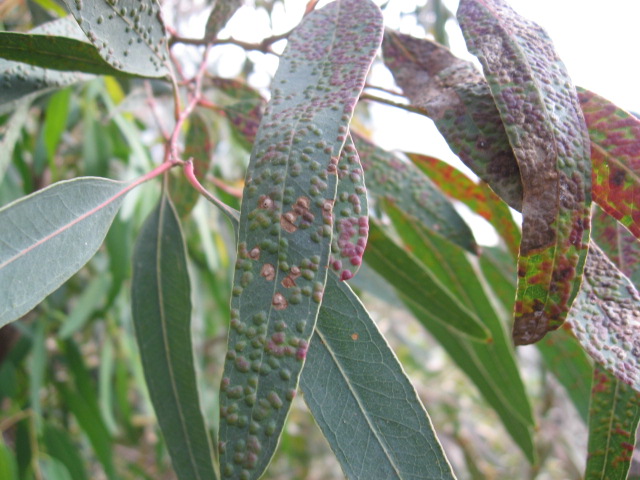 Quelli sulle foglie di Eucaliptus mi sembrano attacchi fungini.