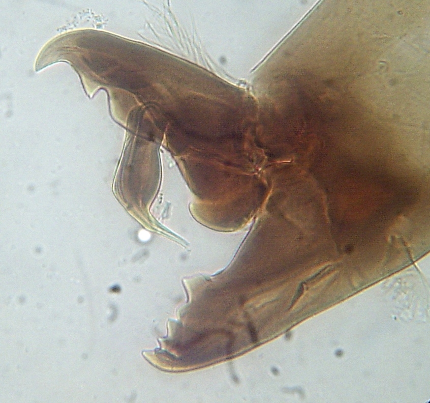 Questo è il chelicero maschile (400X). Notare la presenza dello spermadactilo sul dito mobile, una struttura che serve ad inserire lo sperma in uno speciale poro della femmina (distinto dall'apertura genitale). Anche la forma di questa struttura ha valore diagnostico.