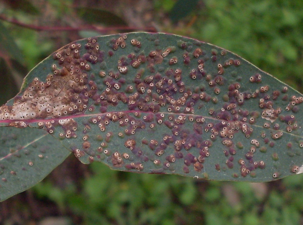 Queste sono galle provocate da uno dei recenti regalini arrivati dall'Australia. Ophelinus maskelli (Ashmead) (Hymenoptera: Eulophidae). I Calcidoidei sono più conosciuti come utilissimi ausiliari nel controllo biologico dei fillominatori e dei galligeni, ma non mancano le specie esclusivamente fitofaghe endofite o altre con regimi alimentari complessi al confine tra la fitofagia e la zoofagia, soprattutto fra gli Eulofidi.