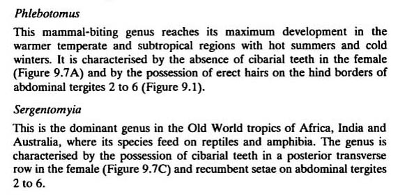 Inoltre sul bordo poteriore dei tergiti addominali (dal 2 al 6) i Phlebotomus presentano peli eretti, mentre nella Sergentomyia i peli dovrebbero essere coricati.