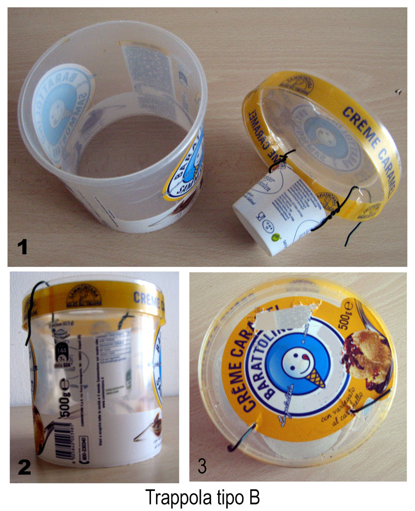 Ciao. Le trappole di tipo A sono praticamente identiche a quelle che preferisco e che ho usato per anni. variando la dimensione dei fori puoi renderle più attrattive (ma con durata minore per l'aumento dell'evaporazione), o al contrario, più durevoli ma un po' meno efficaci.*