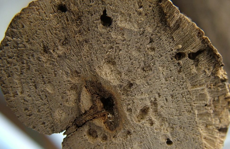 Ecco la tipica sezione appiattita delle gallerie dei Buprestidi. In questo caso è Dicerca alni in tronco di faggio (se ne vede una che attendeva in celletta, che per poco non ho tagliato).