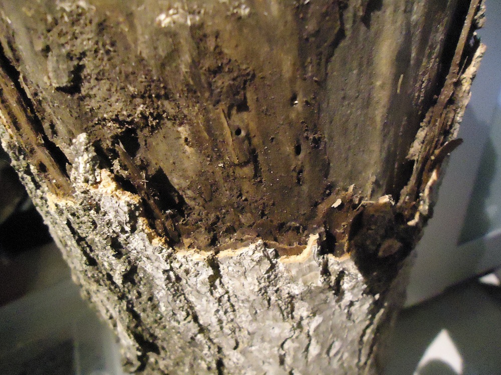 Si, si trovavano proprio tra legno e corteccia, nella fessura che si vede in foto, c'erano molte gallerie