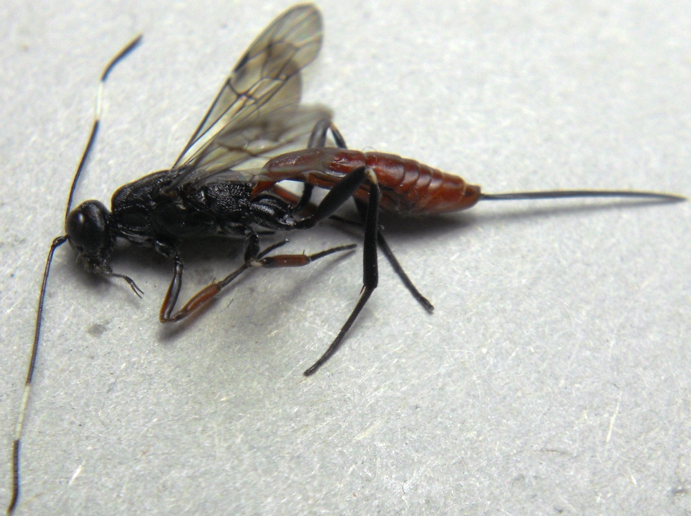 Questo ichneumonide mi è nato il 10 marzo 2012 dal bozzolo che avevo trovato qualche mese fa sotto corteccia, di forma romboidale e di colore scuro, che purtroppo non ho fotografato, ma era piuttosto grande, una trentina di mm..inserisco la data di ritrovamento del bozzolo..questo misura 19mm senza ovopositore, 28mm con ovopositore..se serve qualche particolare ingrandito, basta chiedere.. ;)