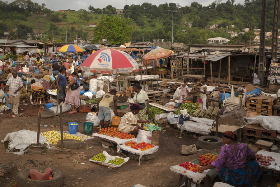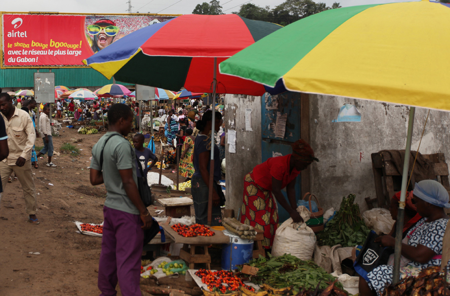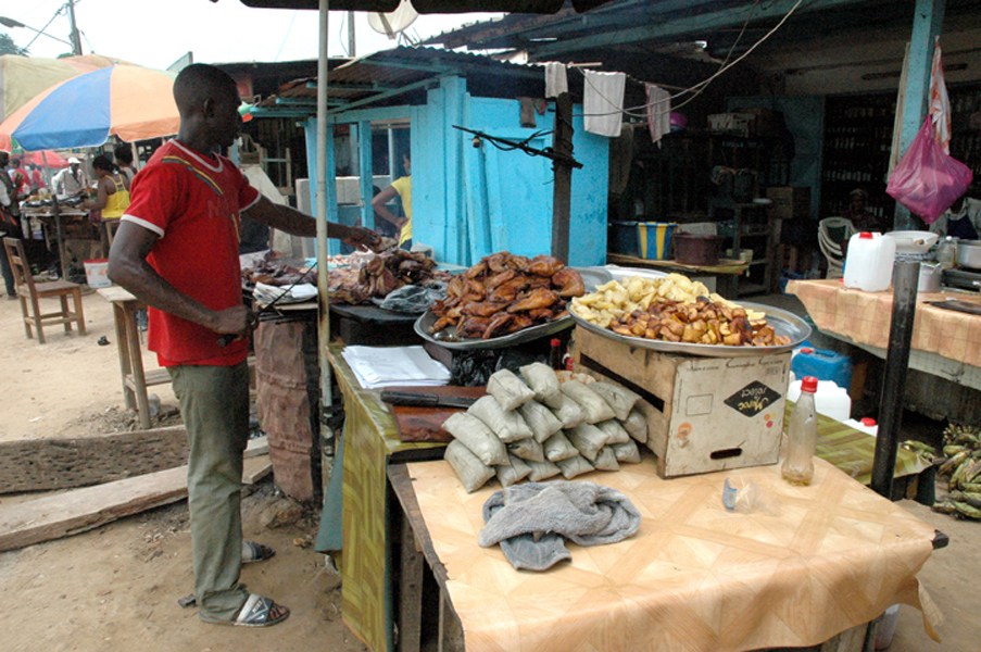 Immagini del maercato alimentare alla periferia di LibrevilleFinalmente alle 09:10, si parte. Ci attendono 600 km di pista sconnessa e in gran parte sterrata. Dopo soltanto 200 metri una sbarra ci chiude la strada, l’autista accosta e un corpulento poliziotto si avvicina. Ci chiede i passaporti e scopriamo che alcuni di noi lo avevano lasciato nel bagaglio. Panico…. Pietro che ha già abbondante esperienza ci tranquillizza e dice che non servono tutti. Bastano un paio! Proviamo, e dopo le solite domande di rito, il poliziotto ci augura buon viaggio.