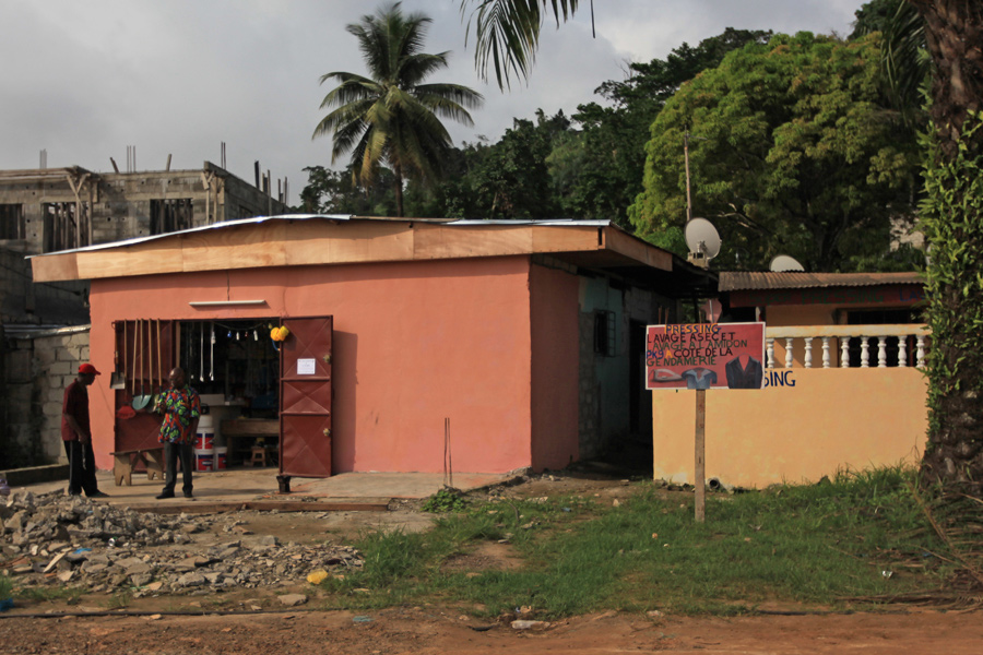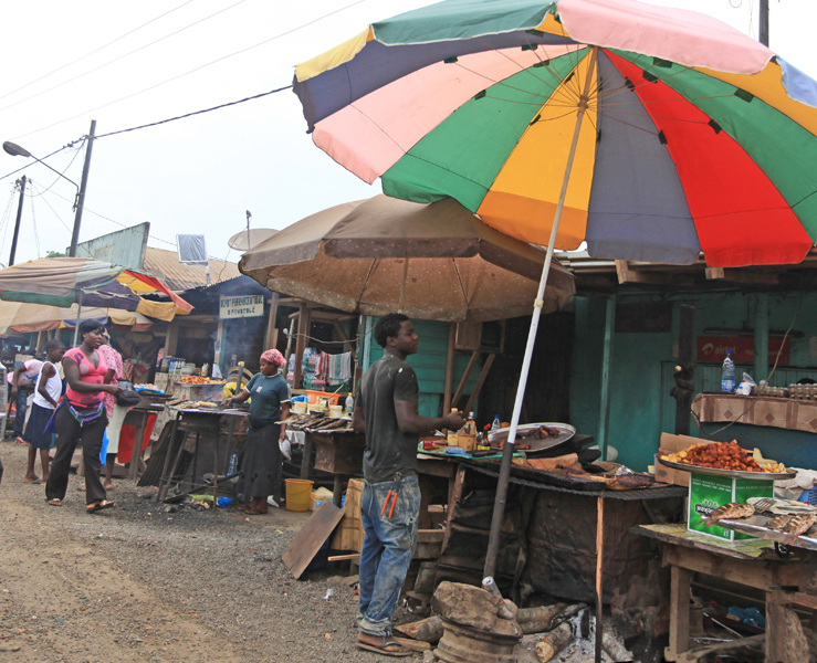 Alcune botteghe in periferia della cittàLungo il tragitto lasciamo libero sfogo ai nostri occhi per ammirare un selvatico paesaggio, tinto in tutte le sfumature di un quasi prepotente verde, interrotto soltanto dalla striscia di asfalto, e corsi d’acqua più o meno estesi. A tratti la strada è perfettamente paragonabile a quelle italiane, a tratti invece presenta enormi voragini che però non sembrava infastidire minimamente la quiete e l'andatura allegra dei nostri autisti locali. In Africa non vige la regola del viaggiare a destra. Ci si mantiene esattamente dove le condizioni del manto lo permettono. Dopo pochi chilometri la maggior parte di noi si abitua allo stile di guida a zig-zag e la fiducia fa tornare qualche sorriso. O era semplicemente rassegnazione?