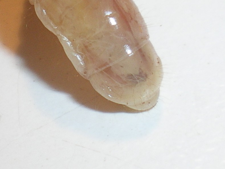 perchè è ancora "trasprente" e si intravedono gli orgni interni di color rossastro violaceo. Nelle larve mature non si vedono più e sono completamente biancastre!
