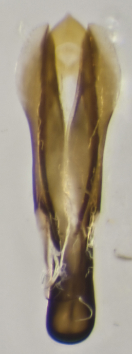 L'edeago di questo esemplare è apparentemente identico a quello dell'elongatus, ma non so come sia fatto quello di emarginatus, e c'è sempre il fattore di incertezza dato dal fatto che estraendo l'edeago di bestioline di queste dimensioni c'è la possibilità che si schiacci e deformi un po', rendendolo magari più simile a quello di un'altra specie, oppure che sia fotografato un po' storto, alterandone le proporzioni (anche se in questo caso mi pare a posto).