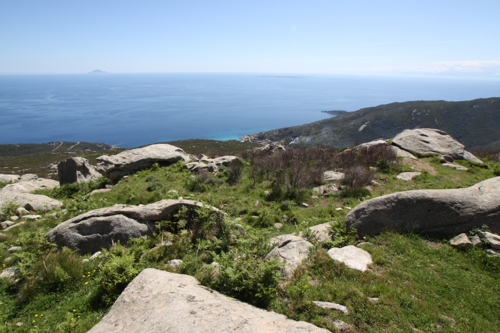Qui un ambiente frequente, alla sommità di una delle tante alture presenti nell'isola. All'orizzonte, la sagoma inconfondibile dell'isola di Pianosa.