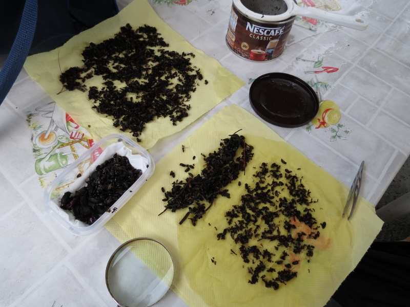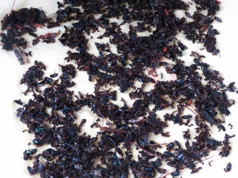 questo miscuglio fotografato, che sembra un trito di ogni tipo di forma di vita entomologica esistente . e' il contenuto delle due trappole ad interiora di pesce ( continuo ad usare le stesse interiora da due mesi cambiando solo l'acqua salata sotto ) .