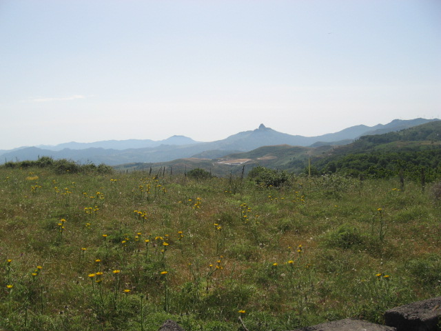Foto panoramica: la montagna "a punta" è Rocca Novara (1340 m) una delle vette più alte dei Peloritani, detta "il Cervino di Sicilia" per il suo particolare profilo. :)
