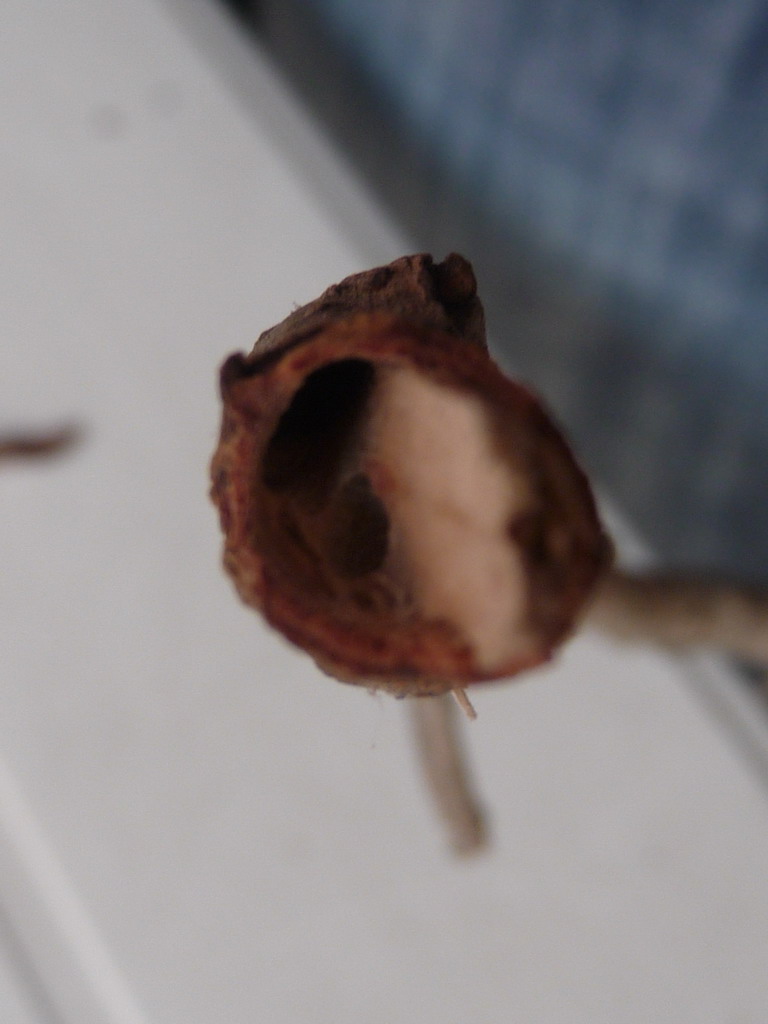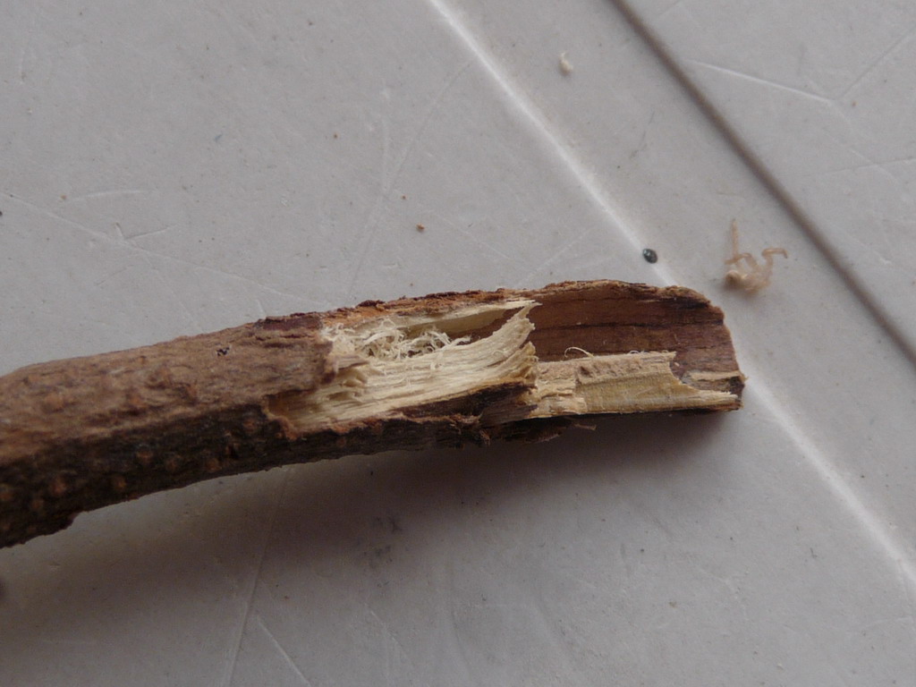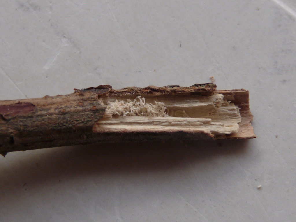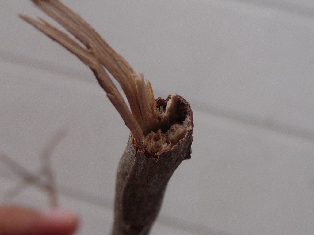 E questa l'estremità, dove quando l'ho staccato sbucava una bella larvetta, con la testa piatta e tonda tipica di Cerambicidi e Buprestidi, che ora dev'essere andata verso l'apice:
