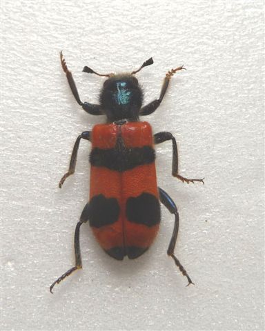 La macchia blu arriva all'apice delle elitre, quindi direi Trichodes apiarius. :no1: ...