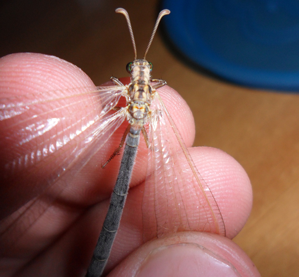 Questo Myrmeleontidae l'ho raccolto oggi insieme a Leonardo, mi è volato vicino e ho pensato fosse un Odonato, ma quando si è posato su uno stelo mi sono accorto che era tutt'altra cosa. Ho provato a prenderlo due volte al volo con il retino, alla fine l'ho preso con le mani appena si è posato.