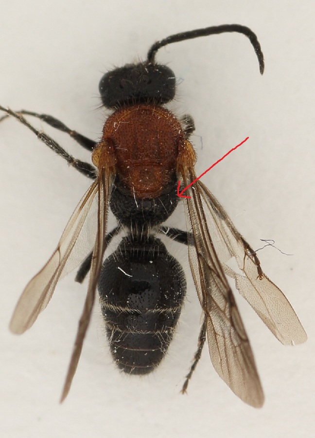 Marcello, ho visto l'esemplare di Leonardo ma nel suo esemplare nella zona indicata dalla freccia vedo del rosso! Normale variabilità? Onestamente non me la sento di estrarlo, se vuoi te lo tengo e se trovo altri mutillidi te lo spedisco! Va bene se te lo tengo in aceto e sale?