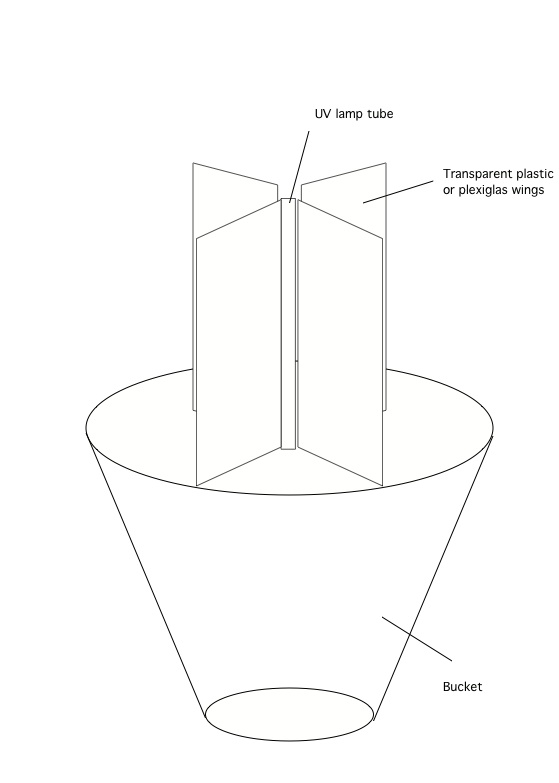 Georgi, if you have the possibilities, try to make a setup like this. Placing the tube horizontal will decrease the range of vizibility for insects and more insects will fall not in the bucket, but around of it. Try to dinf 4 wings of transparent plastic, the insects will hit them flying around the tube and will fall in the bucket.