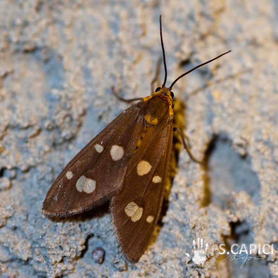 Dysauxes sp. - Arctiidae Syntominae, propenderei per Dysauxes famula (Freyer, 1836) (cf.) poiché spesso in questa specie si osservano individui privi di macchie bianche sulle anteriori.