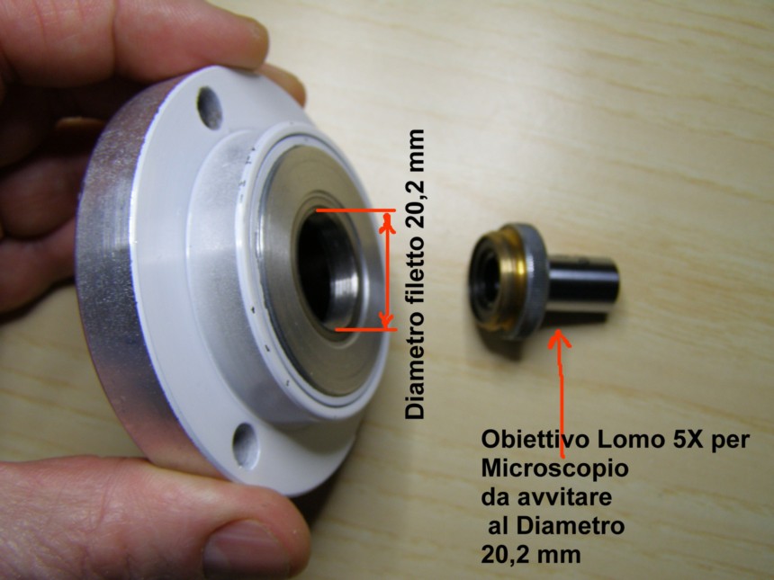 1) Il suo "coperchio" è di recupero o l'hai costruito tu? Puoi darci dei consigli? Allora la campana non è altro che un lampeggiante che si mette sopra agli autoarticolati di soccorso, ne avevamo uno in officina che lo gettavano perchè non più funzionante, l'ho recuperato, smontato e svuotato ( il lampeggiatore in pratica è formato da due parti che si avvitano) poi ho tornito un anello in Teflon bianco, vi ho fatto tutti i fori per l'alloggiamento dei led, e li ho stagnati, infine ho innestato questo anello a circa metà altezza della campana. Cita: 2) Non ho ancora capito con che obiettivo fotografi: quello della fotocamera o aggiungi un duplicatore? cosa è quella cosa che si vede davanti alla camera? L'Obiettivo è quello della fotocamera, che setto in manuale, e quella cosa che vedi davanti non è altro che chiamiamolo anello di riduzione questo , la parte larga va avvitata alla macchina qui , mentre nella parte frontale va avvitato un piccolo obiettivo da Microscopio questo . Cita: 3) Dove hai trovato lo stativo del microscopio, che ne cerco uno da tempo. Lo stativo l'ho acquistato in E-bay dalla cina, (se fai la ricerca in E-bay non scrivere stativo, ma semplicemente Microscopio Nikon, Microscopio Zeiss ecc, vedrai che ne saltano fuori diversi), ma sinceramente non mi soddisfa molto infatti pochi giorni fa ho acquistato a 170 dollari gia compreso di spese di spedizione un'altro stativo che non è altro che il corpo senza obiettivi, condensatore testa con oculari, in pratica è nudo un Nikon Labophot che ha una cremagliera in ottone e delle manopole micrometriche tra le più precise, che adatterò prossimamente.