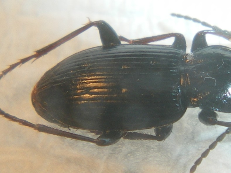 A prima vista sembrerebbe uno Pt. oblongopunctatus, ma mi sembra un po' troppo lucido. Le fossette basali del protorace dovrebbero essere punteggiate anche nell'intorno, mentre qui sembra tutto liscio. La terza interstria dovrebbe avere 5 o 6 punti, qui mi sembra di contarne 4. :?