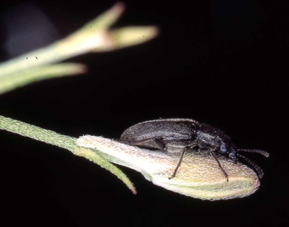 Per quel che ne so, solo su Consolida regalis. In Lazio direi che non è stata ancora presa, ma ne ho raccolto serie numerose in Abruzzo. Come dicevo, è una specie poco vistosa ma facilmente individuabile, una volta trovata la pianta ospite. Se si notano danni di questo tipo (fori circolari) ai bottoni fiorali, la presenza di Nemonyx è certa, e si tratta solo di cercarlo con pazienza.