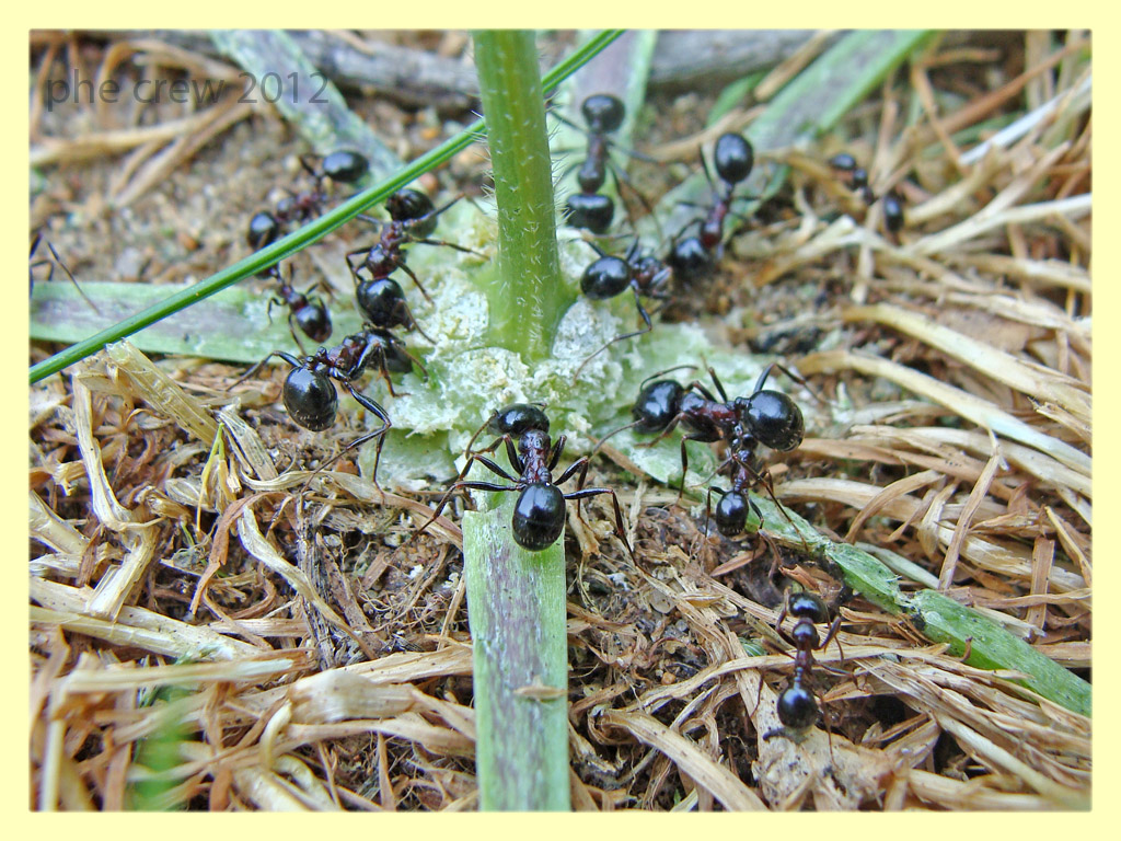 ho beccato queste formiche (credo siano delle Messor sp.) intente a prelevare pezzetti di questa pianta ricoperta da una sostanza bianca, sicuramente dal sapore zuccherino; qualcuno sa dirmi di piu' ?