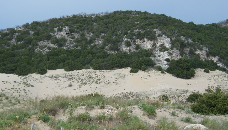 La duna di Kalogria; una spettacolare formaxzione di sabbia alta 20/30 m che il vento ha sospinto sotto la roccia del Capo