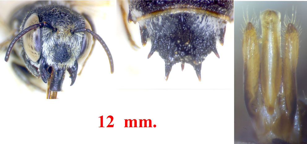 - settore basale del 6° sternite ricoperto da una densa pubescenze di corti peli squamiformi biancastri, interrota al centro da una tozza carena longitudinale lucente.