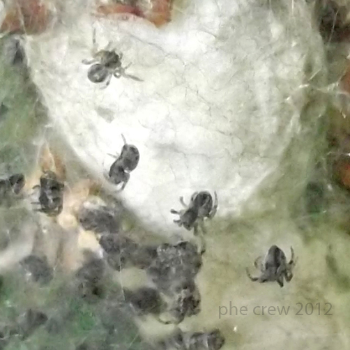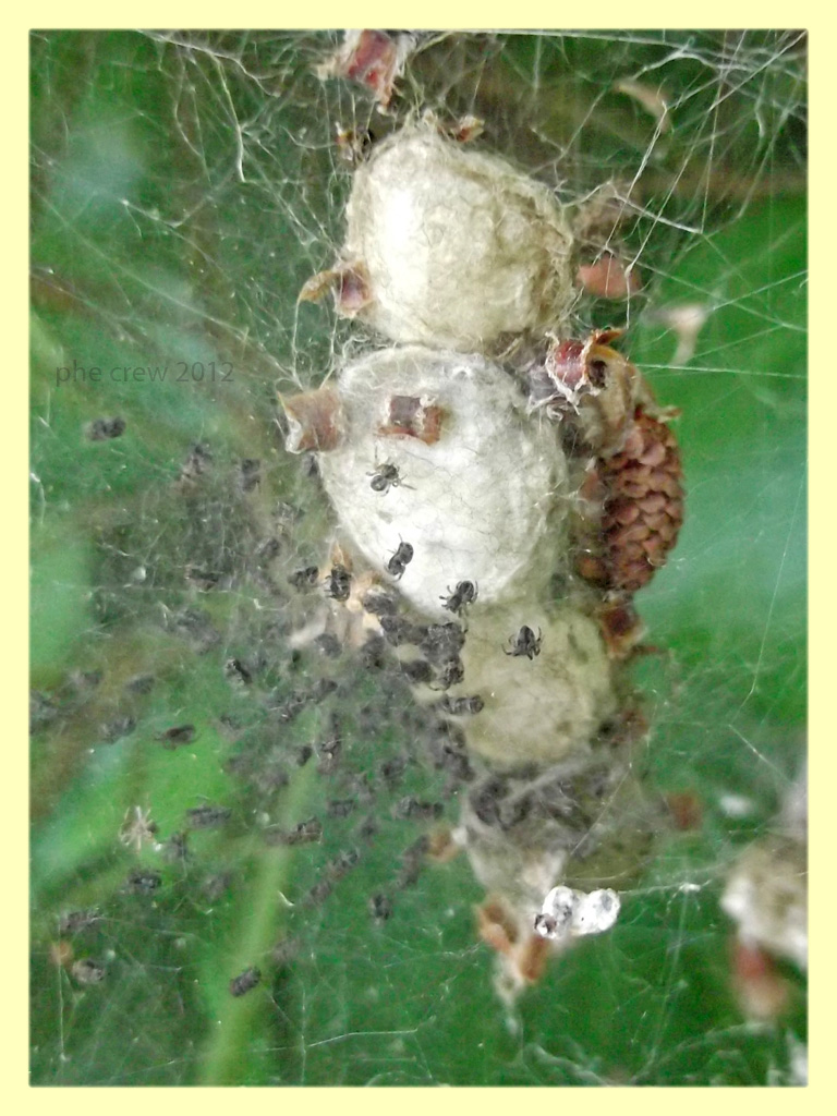 I piccoli sgusciano in successione e si disperdono, ma alcuni si stabiliscono dentro la megastruttura materna costruendo piccole sottoragnatele.
