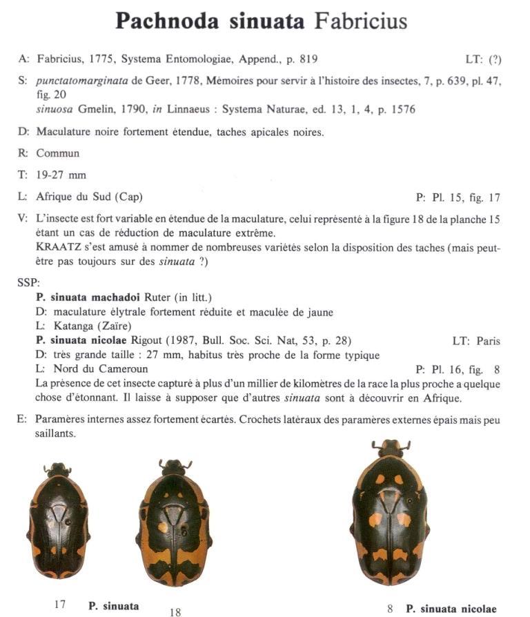 A dimostrazione di quanto dicevo sopra riguardo alla variabilità specifica nel Catalogue of the Coleoptera of South Africa, del Pèringuey (che mi sono ricordato  di avere in PDF) la P.sinuata viene così definita: "This is the most protean of the South African Cetonids" (trad. "Questo è il più mutevole dei Cetonidi sudafricani")  e te pareva! nella descrizione dice tutto e (quasi) il contrario di tutto, può avere... ma anche no, e va avanti una pagina cosi... prova (ormai abbiamo visto che sei diventato bravo  ) a fargli una foto ventrale, una (forse la + importante) del pigidium... riporto: "pygidium immaculate or with 6 small white spots" (il può avere... ma anche no, uno dei tanti...  ) proviamoci... ciao PS: noto dal titolo che è data per classificata... a me non pare siano stati dati elementi sufficienti in tal senso ma nel caso vorrei conoscerli... cosi imparo anche io a distinguere questo tipo di Pachnoda