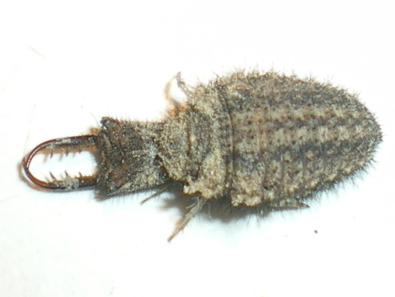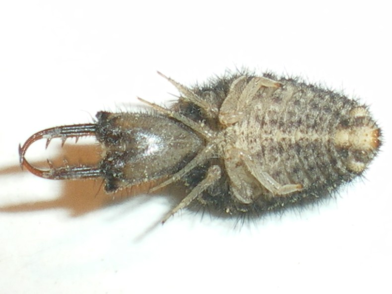 E' probabile che spesso lo si possa vedere a caccia con il forcipe ben più aperto. Parlando fondamentalmente da ignorante (non ho studiato direttamente in natura la cosa se non in modo veramente occasionale e quasi esclusivamente su larve di formicaleoni "dell'altro tipo" (quelle cioé che scavano un imbuto trappola)), tra le caratteristiche delle larve di "formicaleonoidi" (le larve di formicaleoni e di ascalafi, per restare alle famiglie che si possono incontrare in Italia, sono molto simili...) quelle che cacciano seminascoste nel substrato senza un imbuto trappola si muovono generalmente tanto in avanti quanto indietro (viceversa, le larve scavatrici di imbuti trappola in genere procedono solo "a gambero"), mancano di setole allungate sulla parte esterna del forcipe boccale (adattamento morfologico probabilmente utilizzato quando presenti per aiutare la larva nel gettare verso l'esterno il terreno smosso mentre scavano l'imbuto trappola) ed hanno una muscolatura più robusta per operare un "morso" più forte contro le prede che si spostano più liberamente di quelle che invece cadono negli imbuti trappola. Da qui anche la maggiore apertura del forcipe, sino a 180°. Speriamo che Dilar non mi  troppo Buone cose