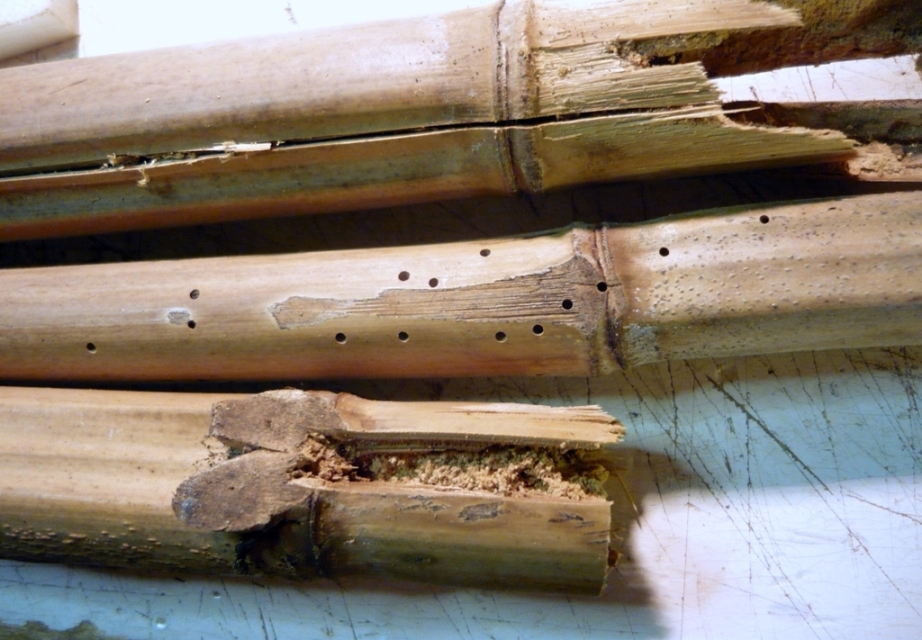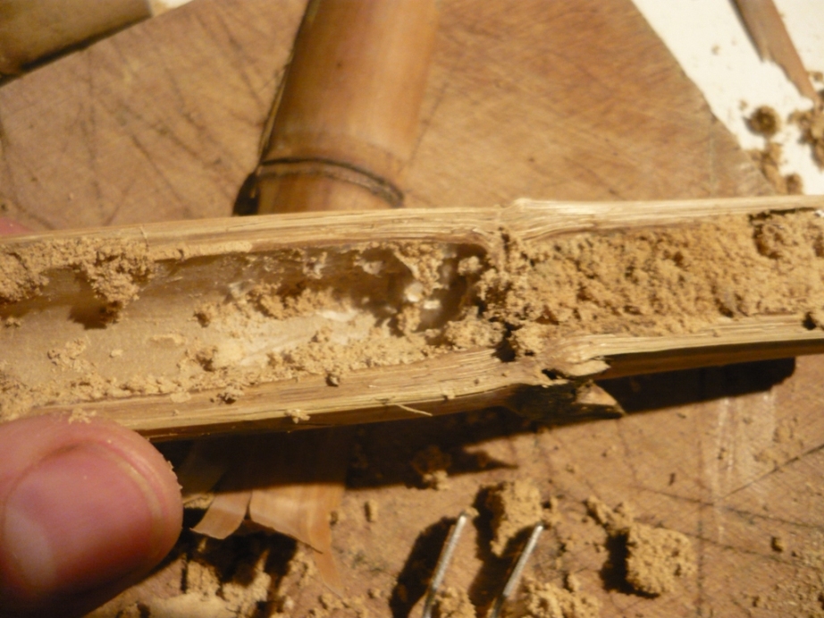 Edit: A larva di Chlorophorus annularis non danneggia a superficie interiore o esteriore della legna di bambù. A polvere resta in mezzo alla parete del bambù. Solo o adulto fa um foro con un margine sfrangiato.