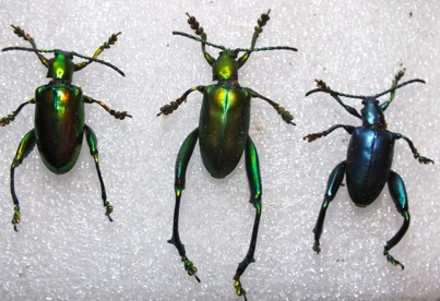 Nell'ordine: il primo cerambicide misura 40 mm circa, il primo buprestide 50 mm circa, il secondo cerambidice (sedicente Dorystenes walkeri) misura 52 mm circa, il secondo buprestide 43 mm circa, i tre crisomelidi (sedicenti Sagra femorata) vanno dai 20 ai 23 mm, il terzo buprestide misura 54 mm circa ed il cetonino (Torynorrhina flammea) misura 30 mm circa.