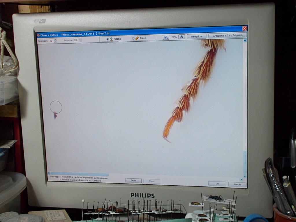 Lo stesso si fa con le parti di sfondo in cui siano presenti macchie, ombre, fili, grumi di colla, ecc., ed in questo caso la parte di ovopositore rimasta in foto. Questa seconda parte di ritocco è più semplice della prima. Si consiglia comunque di salvare dopo aver fatto modifiche importanti.