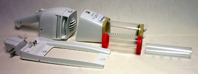 Aspiratore elettrico per insetti "poco igienici" Tempo fa ho acquistato in Inghilterra (pare che li usino quasi solo gli inglesi) uno di quegli strani aggeggi chiamati aspira-ragni o aspira-insetti, per chi ha paura di questi animaletti ma non ha il coraggio di schiacciarli. Mi è arrivato questo attrezzo: Con qualche modifica penso di poterlo usare per aspirare insetti che vivono in ambienti nei quali non è indicato usare un aspiratore a bocca, per motivi igienici. Le modifiche principali riguardano il beccuccio di aspirazione, troppo grande e corto, che lascerebbe scappare quanto catturato, e la reticella posta prima della ventola di aspirazione, a fori troppo grandi, che lascerebbero passare insetti di un paio di mm di lunghezza. Fortunatamente l'aspiratore viene fornito con due tubi in plastica trasparente e un connettore di plastica biancastra per usarlo con entrambi i tubi montati. Inoltre c'è anche un tappo azzurro per chiudere l'aspiratore una volta catturato il ragno/insetto. Il connettore è perfetto per inserire una reticella a maglie più fini (per ora ho usato un pezzo di stoffa), mentre il tappo, una volta forato, permette di inserire un tubetto di una penna a sfera, da usare come tubo di aspirazione (bloccato poi con colla a caldo. Il filtro originale in plastica, saldato sul corpo dell'aspiratore, l'ho eliminato tagliando l'estremità del corpo. Il risultato è questo: La camera di aspirazione può essere staccata dal gruppo motore/impugnatura, e resta comunque chiusa da una parte dal tappo col tubetto (su cui si può inserire un tappino, quello della penna), dall'altra dal filtro. L'alimentazione è ottenuta con una pila a 9V inserita nell'impugnatura Da qualche prova fatta sembra funzionare benino. Il difetto principale, oltre al fatto che è ovviamente più rumoroso di quello a bocca, è che la potenza di aspirazione non è elevata. In particolare manca il colpo iniziale che si riesce a dare aspirando coi polmoni. Analizzata la struttura della ventolina, ci sarebbe il modo di rendere l'aspirazione più efficiente inserendo un semplice anello di gomma o di plastica vicino alla ventola di aspirazione, ma purtroppo il corpo in plastica è incollato, e non si può aprire senza romperlo, quindi ho deciso di ricorrere ad un sistema meno elegante. Considerato che verrà sempre usato per pochi secondi per volta, ho pensato di aumentare l'aspirazione semplicemente sovralimentandolo, usando una alimentazione a 12V invece dei 9V attuali. Ho appena ordinato questo contenitore per 8 pile ministilo, che quando mi arriverà fisserò direttamente all'esterno del corpo dell'aspiratore, subito sopra la bocchetta di scarico. In questo modo la maggiore tensione dovrebbe far girare il motorino abbastanza velocemente da avere una aspirazione sufficiente, e soprattutto più immediata.