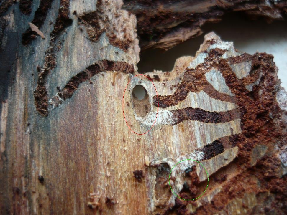 Vorrei però tornare sull'immagine proposta e su quelle gallerie che tutti hanno attribuito a scolitidi. Mi pare ovvio che il foro di uscita non può essere attribuito a quegli scolitidi, viste le dimensioni. Osservando la struttura a stella delle gallerie e la forma della celletta, continuo a pensare che le abbiano prodotte dei curculionidi, forse del genere Pissodes. Ammesso che di xilofagi non mi sono mai occupato, mi piacerebbe sentire il parere di Enzo.