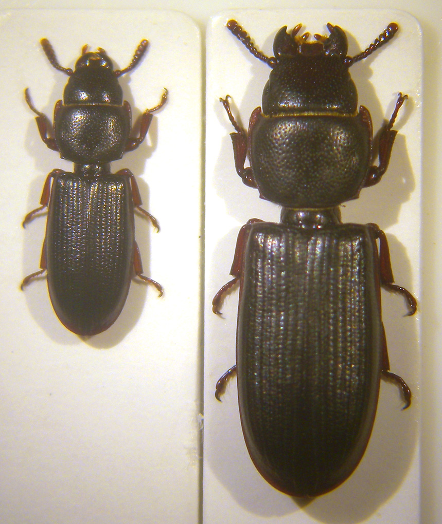 Ieri mattina ho trovato sotto allo stesso pezzo di corteccia due esemplari di Tenebroides fuscus;li inserisco nella stessa discussione per evidenziare la notevole differenza di dimensioni.In un primo momento ho pensato che si trattasse di un maschio ed una femmina, ma ho verificato che sono due femmine.