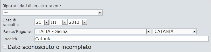 L'ultimo campo è riservato alla località di raccolta, che può essere un qualsiasi comune della provincia (o stato estero), compreso il capoluogo (nel qual caso si ripete il nome di questo, come nel caso di Catania). Essendo un campo libero, ci si possono indicare anche altre cose (toponimi locali, altitudine, modalità di raccolta o qualunque altra cosa), ma non va lasciato in bianco, altrimenti il sistema non consente l'invio del messaggio (se non si conosce niente, basta scrivere -, oppure _ o ., ed è sufficiente).