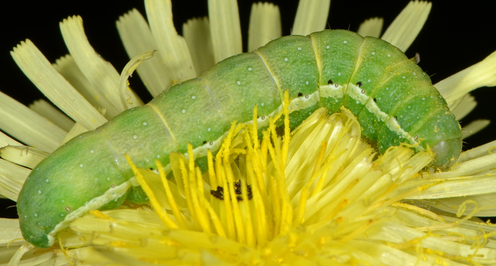 Grosso bruco (30 mm circa) che mangiava i petali di un fiore di Taraxacum.