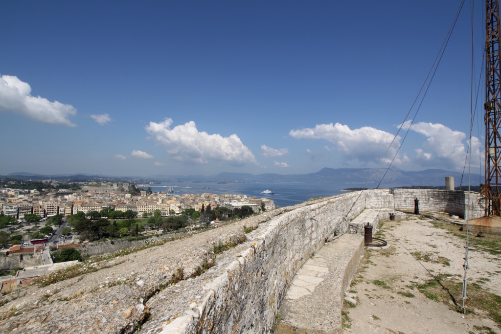 un'immagine del capoluogo visto dall'antica rocca veneziana. Al centro, l'ampio golfo a nord della città e più oltre la sagoma dei monti più alti dell'isola, che culminano nei quasi mille metri del Monte Pantokratoros.