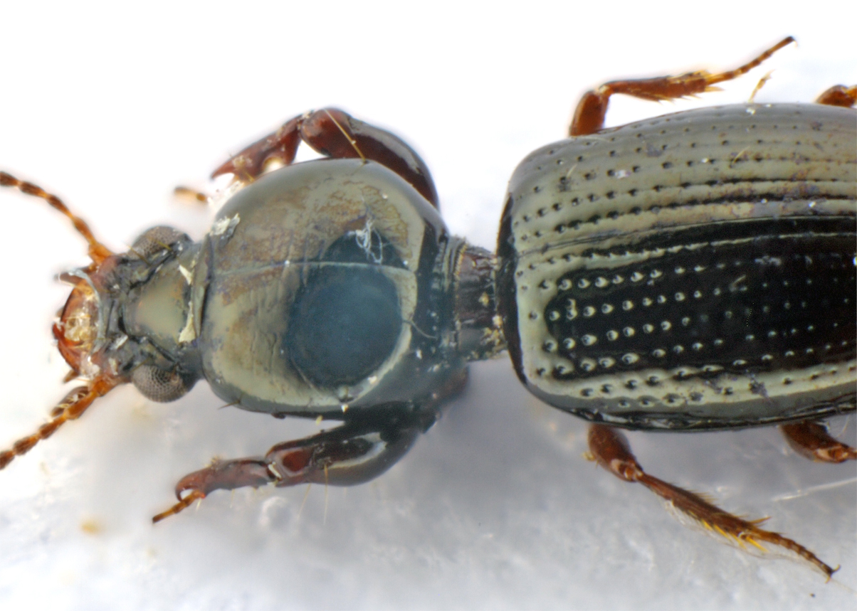 mi servirebbe una foto più chiara... o un'osservazione diretta (da parte tua ;) ): all'incirca nel punto più largo del protorace, subito prima che questo inizi a restringersi verso l'articolazione col mesotorace, a ogni lato c'è un poro setigero (se non c'è più la setola, c'è cmq il poro); bene, l'orlo lat. del pronoto in addietro arriva fino al poro in questione, o svanisce prima? orientativamente, a metà distanza fra il poro e gli angoli ant., o anche più avanti