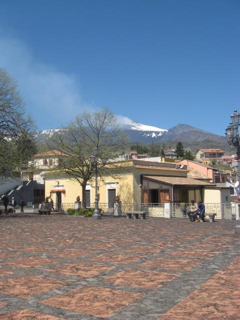 Milo: Panorama del paese con i crateri sommitali del vulcano innevati