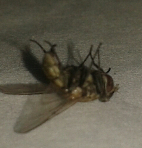 Così si vede qualcosa di più. Quella specie di pungiglione mi fa venire in mente Stomoxys calcitrans (Linnaeus 1758), Muscidae, nota anche come mosca delle stalle. Con quella proboscide punge e succhia il sangue dei mammiferi e se capita anche dell'uomo.
