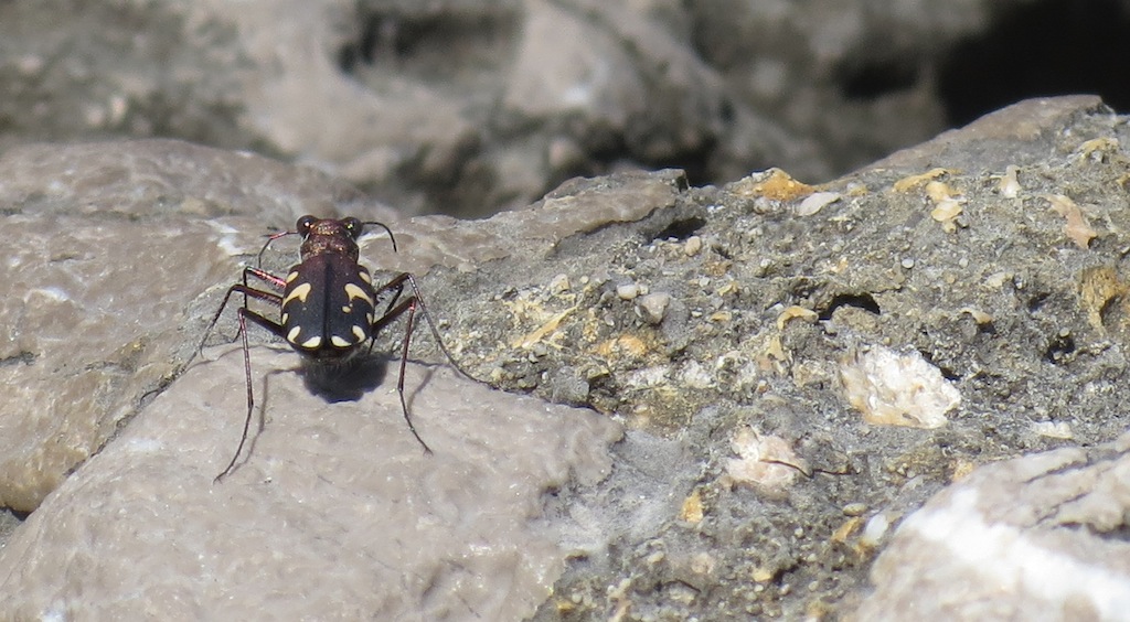 Al ritorno, mi racconta di un incontro particolare: rientrando da una nuotata, risalendo sugli scogli si trova di fronte una cicindela bruna con piccole macchiette bianche ...... :ocup