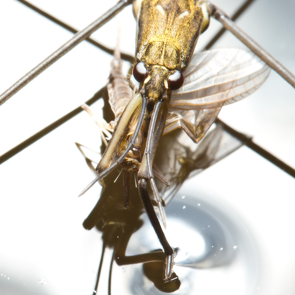 Quelli con cui ho fatto più fatica in assoluto sono stati - per ora - le idrometre: terrorizzate all'idea si stare sotto al matacubo bianco... si spostavano giusto di quel poco sufficiente ad uscire dall'inquadratura (magari per rifugiarsi sotto al corpo macchina, evidentemente da loro ritenuto più sicuro). L'unico esemplare che sono riuscito a fotografare è stato questo, intento a suggere una preda: