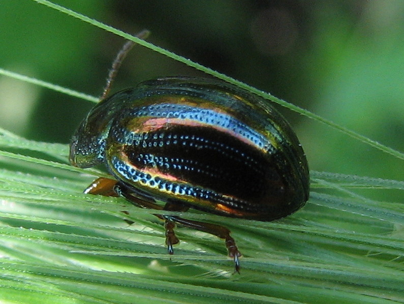La Chrysolina americana, detta crisolina del rosmarino, è un Chrysomelidae bellissimo, con le sue strisce metallizzate e lucenti blu punteggiato e arancio. Frequenta da anni il mio cespuglio di rosmarino ed è davvero inconfondibile, perciò mi permetto di postare alcune foto scattate anche in momenti diversi. Grazie e ciao nicoletta